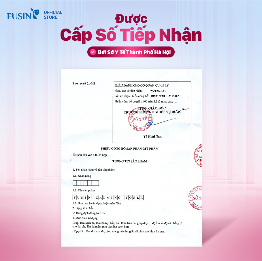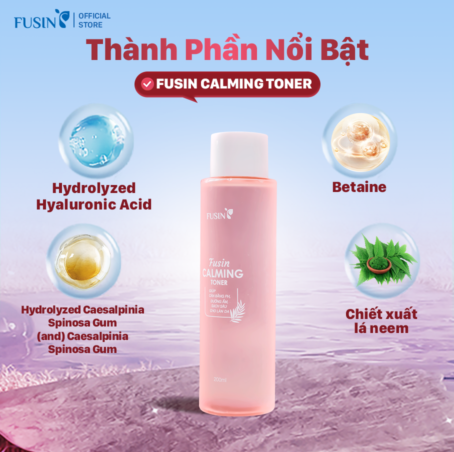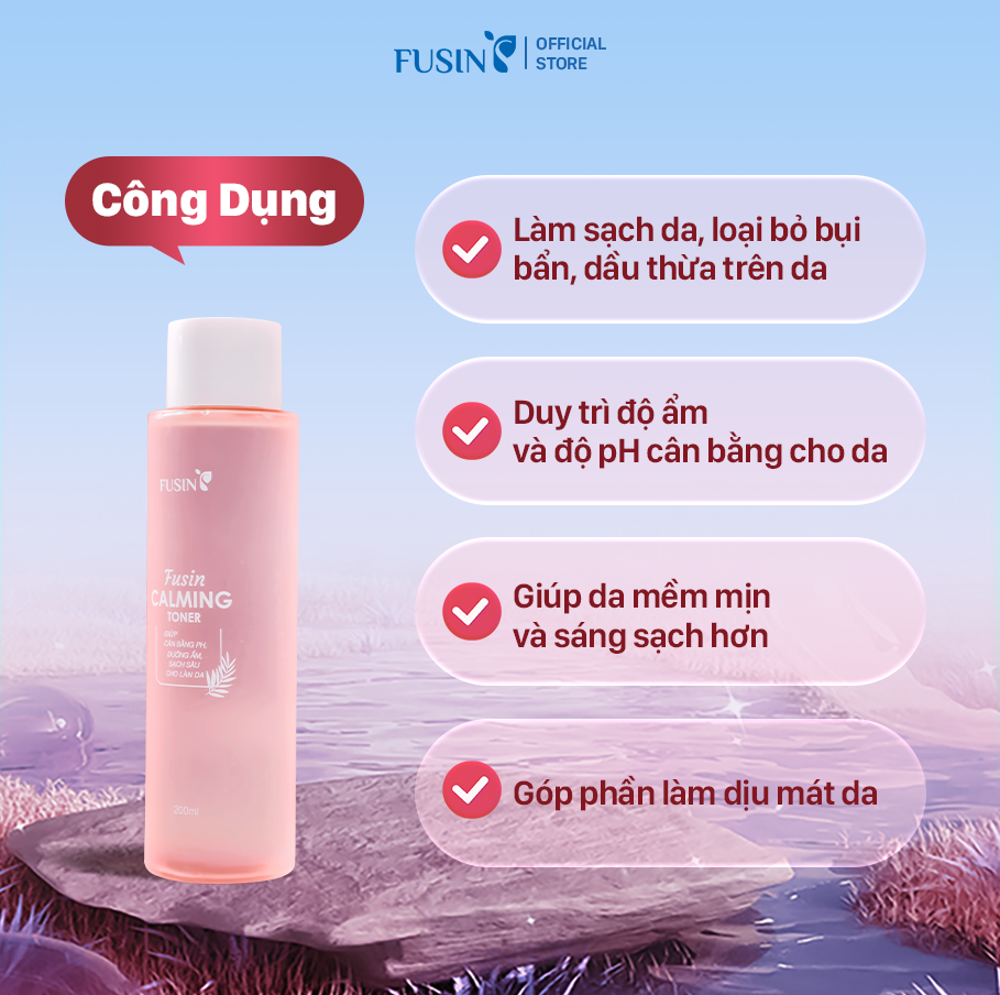 Fusin Calming Toner có kết cấu lỏng nhẹ, trong suốt, dễ dàng thấm vào da và mang lại cảm giác mát, không gây nhờn rít. Sản phẩm giúp làm sạch, loại bỏ bụi bẩn, dầu thừa trên da, đồng thời giúp duy trì độ ẩm và độ cân bằng pH cho da. Khi sử dụng, toner mang lại cảm giác dịu mát, dễ chịu, giúp làn da mềm mịn, sáng sạch hơn. Đặc biệt, với tỷ lệ cồn vừa phải, sản phẩm giúp da thông thoáng nhưng không gây khô căng.