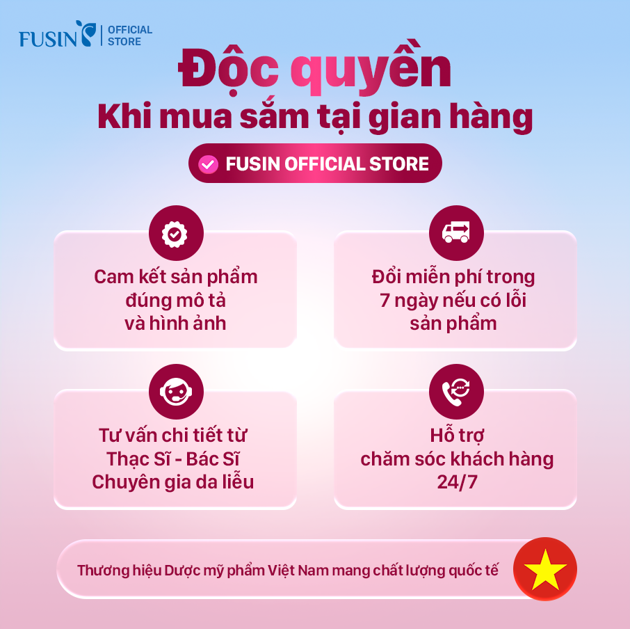 Fusin Việt Nam là thương hiệu dược mỹ phẩm với hơn 15 năm kinh nghiệm trong lĩnh vực chăm sóc và xử lý các vấn đề của da. Với đội ngũ chuyên gia và công thức tiên tiến, Fusin cam kết mang đến giải pháp làm đẹp an toàn và hiệu quả cho làn da Việt.