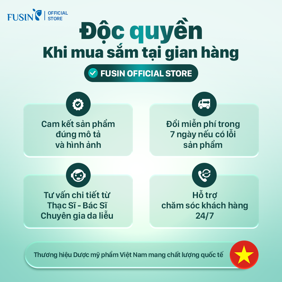 Fusin Việt Nam là thương hiệu dược mỹ phẩm với hơn 15 năm kinh nghiệm trong lĩnh vực chăm sóc và điều trị da. Với đội ngũ chuyên gia và công thức tiên tiến, Fusin cam kết mang đến giải pháp làm đẹp an toàn và hiệu quả cho làn da Việt.