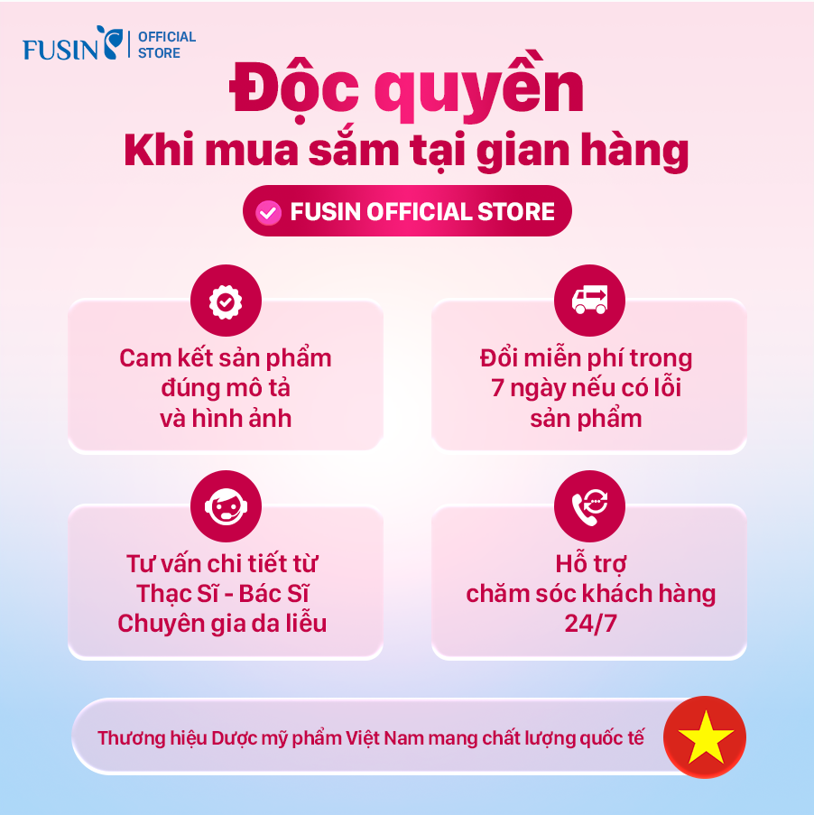 Fusin Việt Nam là thương hiệu dược mỹ phẩm với hơn 15 năm kinh nghiệm trong lĩnh vực chăm sóc và điều trị da. Với đội ngũ chuyên gia và công thức tiên tiến, Fusin cam kết mang đến giải pháp làm đẹp an toàn và hiệu quả cho làn da Việt.