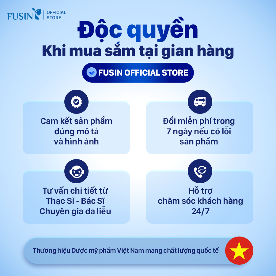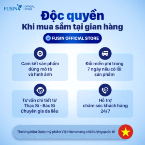 Fusin Việt Nam là thương hiệu dược mỹ phẩm với hơn 15 năm kinh nghiệm trong lĩnh vực chăm sóc và điều trị da. Với đội ngũ chuyên gia và công thức tiên tiến, Fusin cam kết mang đến giải pháp làm đẹp an toàn và hiệu quả cho làn da Việt.