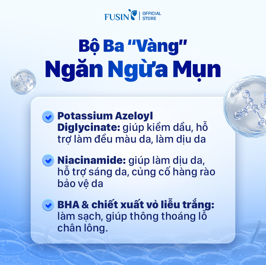 Niacinamide: giúp kiềm dầu, kháng viêm, giảm mẩn đỏ, hỗ trợ làm sáng vùng da sau mụn và củng cố hàng rào bảo vệ.
