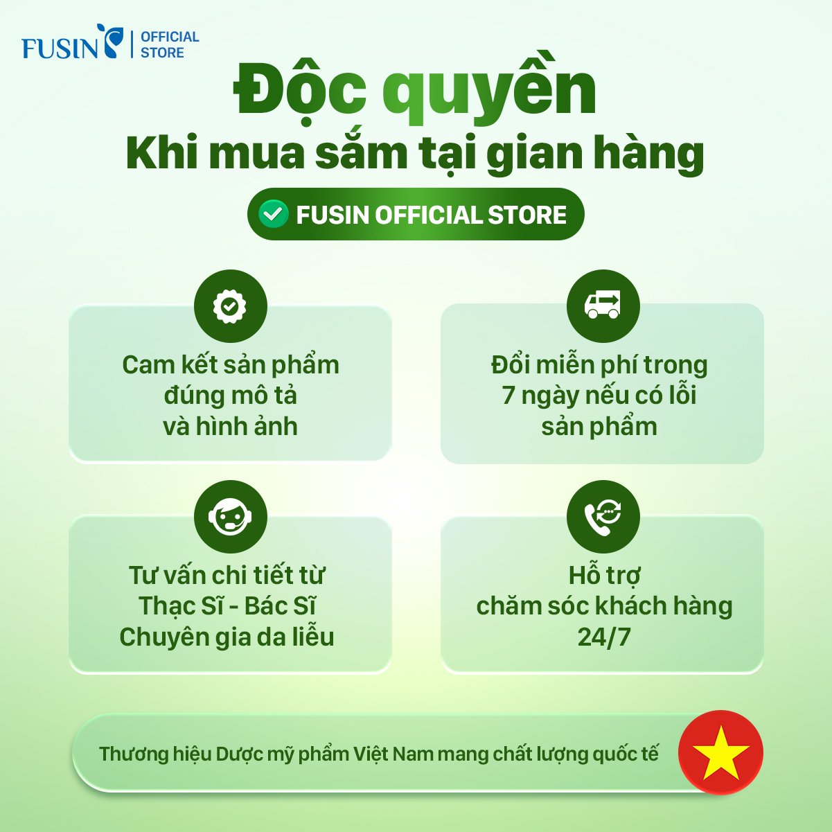 Fusin Việt Nam là thương hiệu dược mỹ phẩm với hơn 15 năm kinh nghiệm trong lĩnh vực chăm sóc và điều trị da. Với đội ngũ chuyên gia và công thức tiên tiến, Fusin cam kết mang đến giải pháp làm đẹp an toàn và hiệu quả cho làn da Việt.