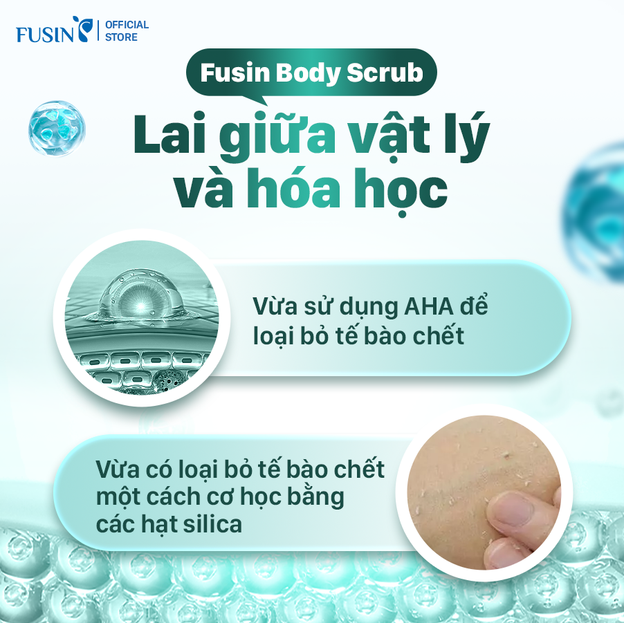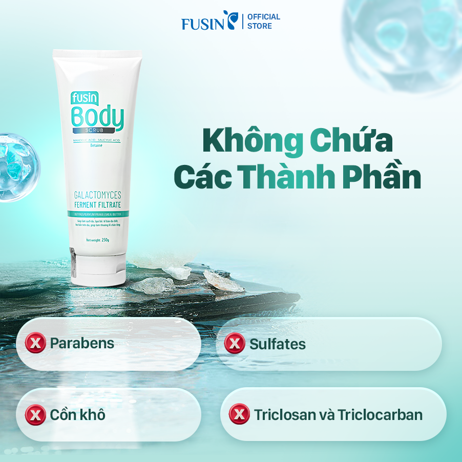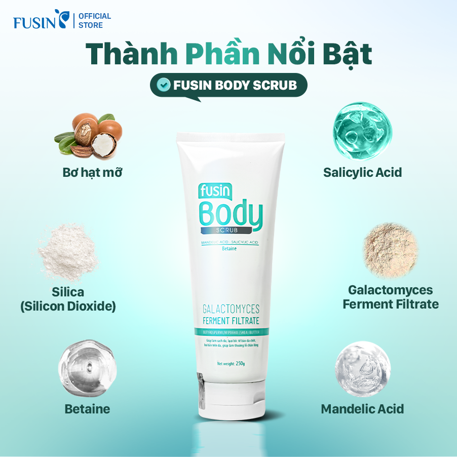 Fusin Body Scrub có kết cấu dạng kem chứa các hạt scrub mịn từ silica, kết hợp cùng các acid tẩy da chết dịu nhẹ như Mandelic Acid và Salicylic Acid giúp loại bỏ tế bào chết, bụi bẩn, bã nhờn trên bề mặt da. Sản phẩm mang lại cảm giác dễ chịu, không gây khô căng sau khi sử dụng. Đồng thời, có các thành phần giúp dưỡng ẩm, làm mềm mịn và mang đến làn da sạch sẽ. Sản phẩm sử dụng hạt Silica có kích thước phù hợp, không góc cạnh, không gây trầy xước.